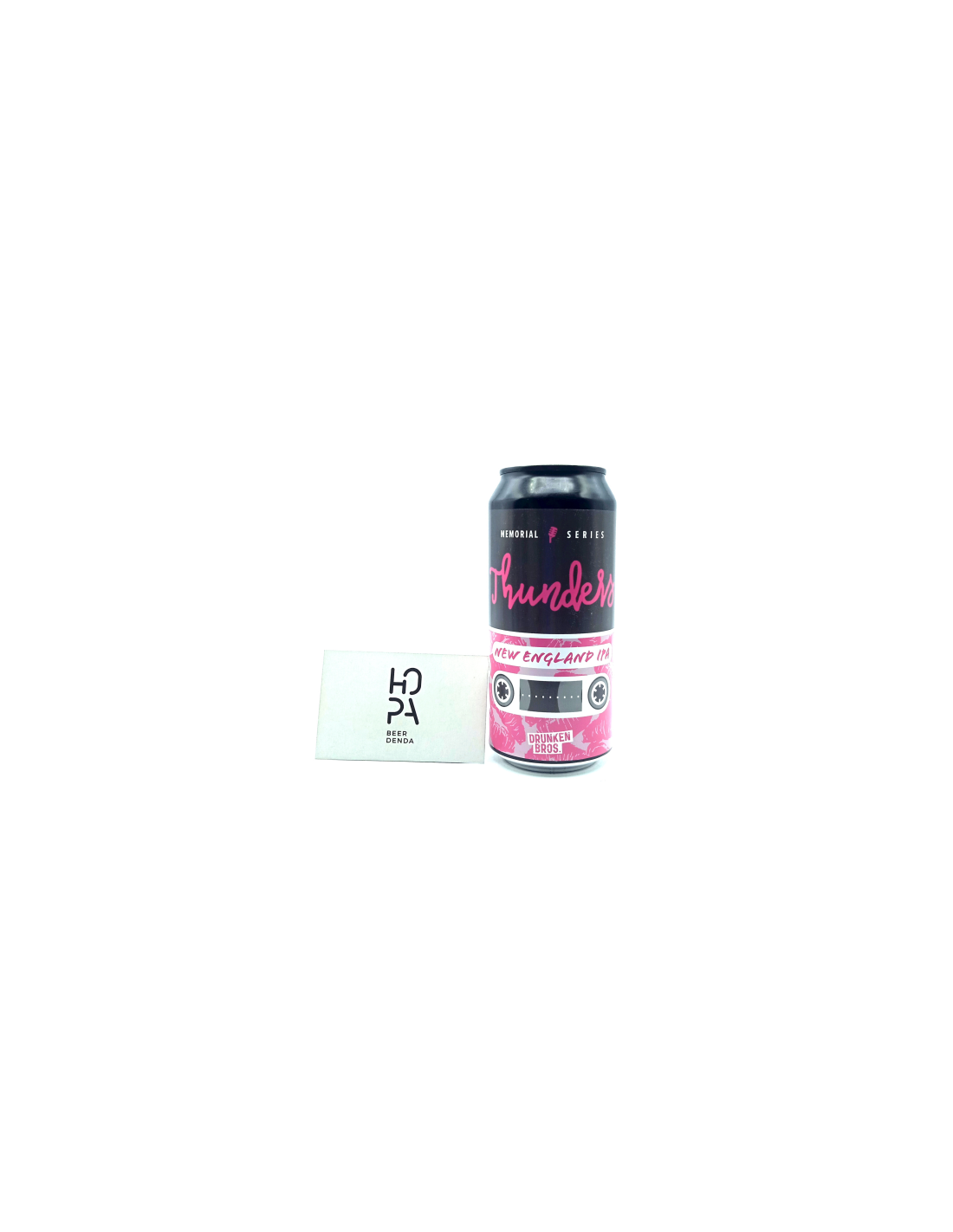 THUNDERS, Neipa de 7,2% ABV con lúpulos Mosaic, Ekuanot y Citra. De tono amarillo pálido, turbia, con aromas suaves, en boca resulta sedosa y potente con un punto final amargo suave. En la linea de las cervezas de Drunken Bros
